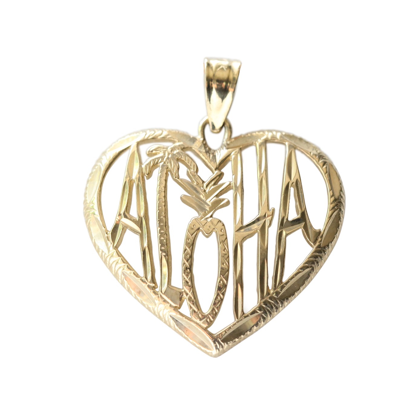 14K Gold Aloha Heart with Diamond Cuts Pendant Hawaii