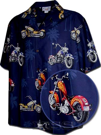 American Bikers Motorcycle Men's ShirtAuthentic Hawaiian shirts have gone beyond the traditional images of pineapples, birds, and hula girls. Our Hawaiian shirts now include prints depicting many different activities. Prints featuring sports like golf and pastimes like motorcycle riding are an excellent way to capture the essence and attitude of the people engaged in these activities.
