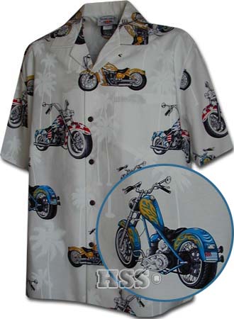 American Bikers Motorcycle Men's ShirtAuthentic Hawaiian shirts have gone beyond the traditional images of pineapples, birds, and hula girls. Our Hawaiian shirts now include prints depicting many different activities. Prints featuring sports like golf and pastimes like motorcycle riding are an excellent way to capture the essence and attitude of the people engaged in these activities.