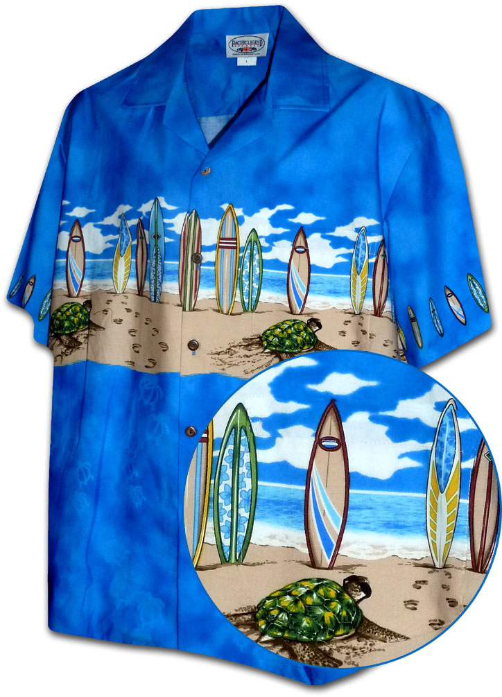 Cotton Hawaiian Shirt Turtle Beach Surfboards Blue