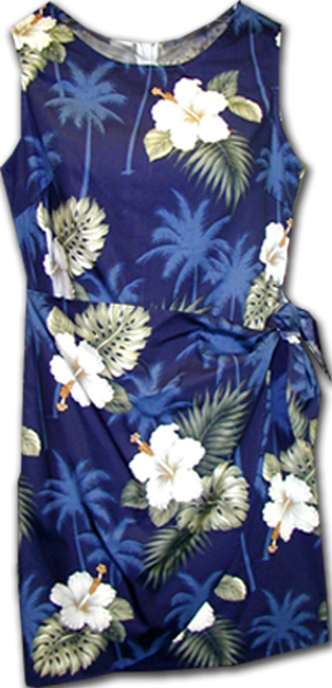 > Cotton Hawaiian Dresses Navy Sarong Hibiscus Islands