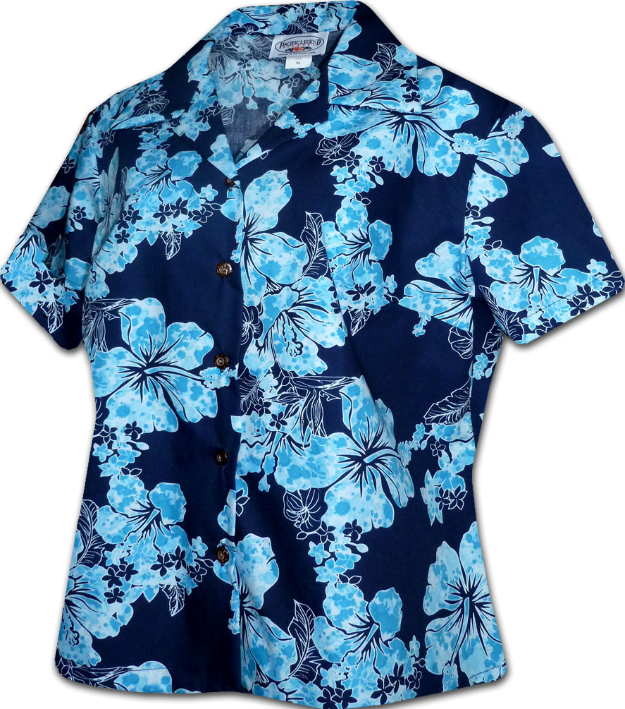 > Ladies Fitted Hawaiian Shirts Tie Dye Hibiscus Blue