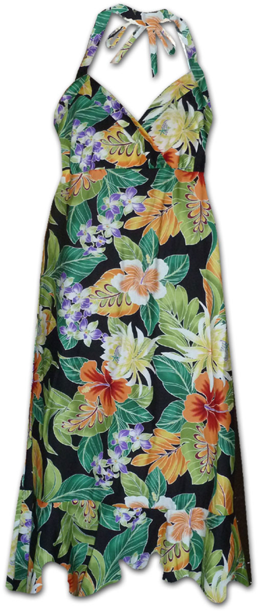 Maui Tropics Hawaiian Halter Dress Black - Halter dress's call extra attention to the upper half of your body. This includes your shoulder, face, and bust. An added advantage of this style of dress is it draws unwanted attention away from hips or legs.