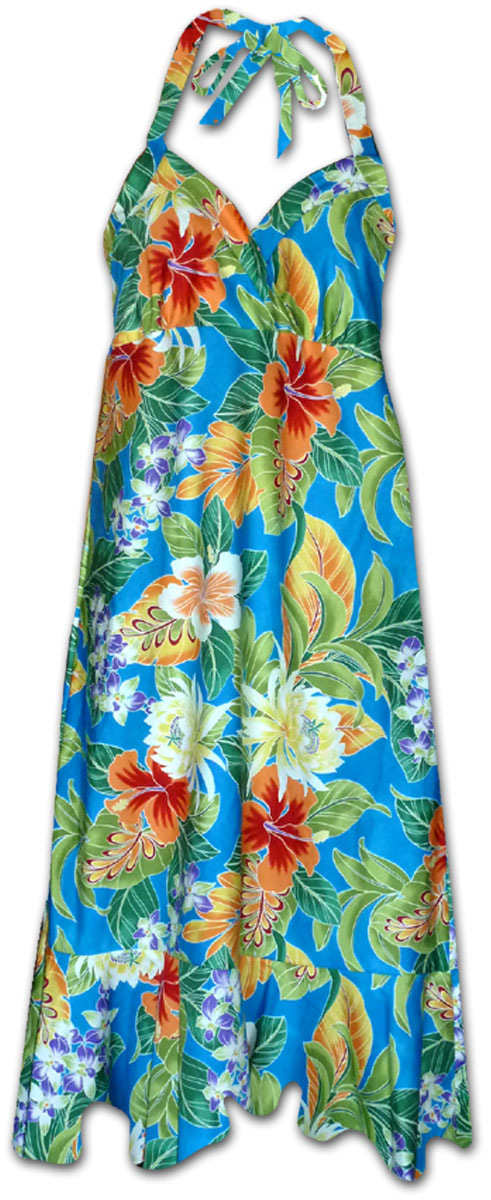 Maui Tropics Hawaiian Halter Dress Blue - Halter dress's call extra attention to the upper half of your body. This includes your shoulder, face, and bust. An added advantage of this style of dress is it draws unwanted attention away from hips or legs.