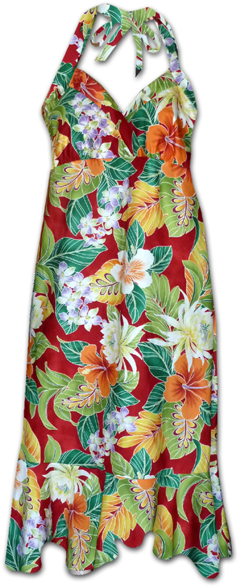 Maui Tropics Hawaiian Halter Dress Red - Halter dress's call extra attention to the upper half of your body. This includes your shoulder, face, and bust. An added advantage of this style of dress is it draws unwanted attention away from hips or legs.