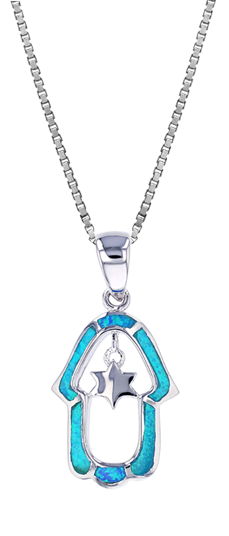 Opal Blue Sterling Silver Hamsa Star of Fatima Jewish Pendant