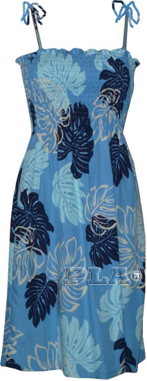 Adorable sundress with allover tropical Hawaiian flower prints, adjustable spaghetti straps, stretchy smocked top. Paradise Island Blue Rayon Smocked Hawaiian Dress