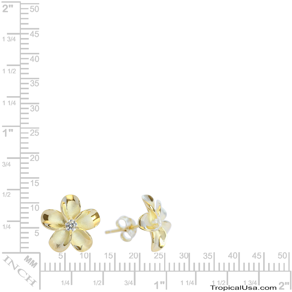 > Sterling Silver Gold Plated CZ Plumeria Stud Earrings Hawaii
