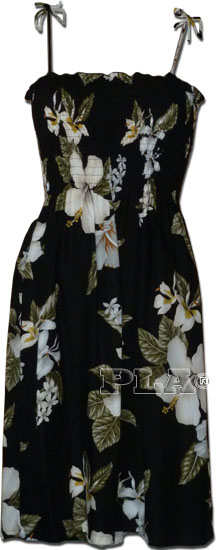 Tropical Fusion Black Rayon Smocked Hawaiian Dress Adorable sundress with allover tropical Hawaiian flower prints, adjustable spaghetti straps, stretchy smocked top.