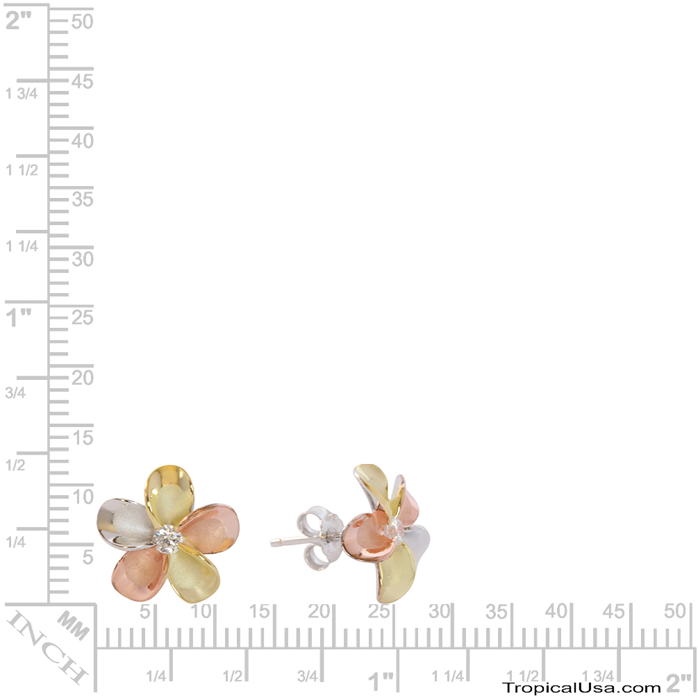> Sterling Silver Tricolor Gold Plated CZ Plumeria Stud Earrings Hawaii