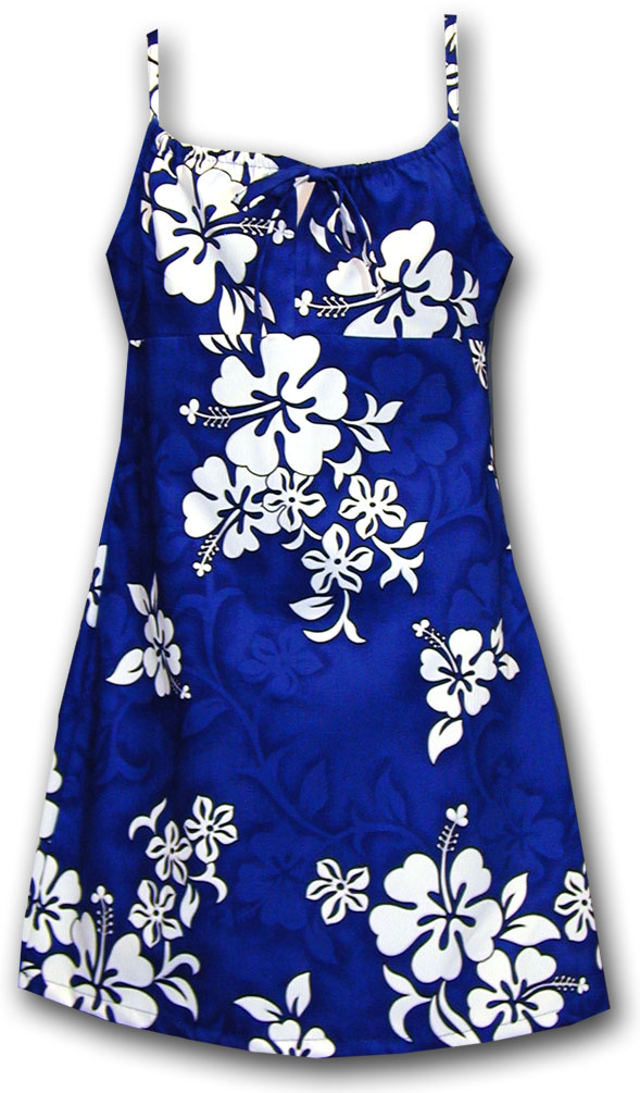 > White Hibiscus Girls Blue Spaghetti Aloha Dress